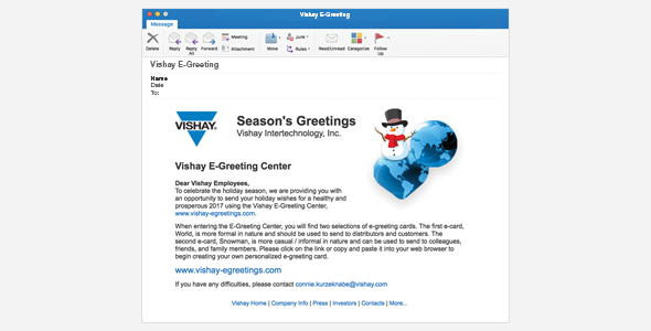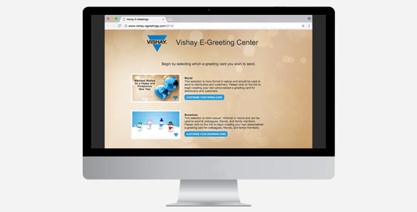 The holiday eCard was developed for Vishay employees to send to customers, colleagues, friends, and family. I designed an announcement email blast that was distributed to all employees. This directed them to a landing page where they would start their customized eCard. I created a formal animation that was similar in design to the company holiday card that was sent out to customers. I also created a casual / informal fun holiday themed animation. Both video animations were translated into five different languages.